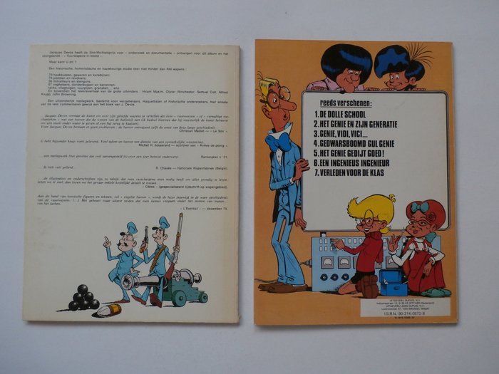 2x een grote en mooie opdrachttekening met begeleidende tekst en handtekening door Jacques Devos in 'Geniale Olivier deel 7' uit 1979 en 'Geheime en rare wapens' uit 1974. De tekeningen zijn gemaakt en gedateerd in 1980.