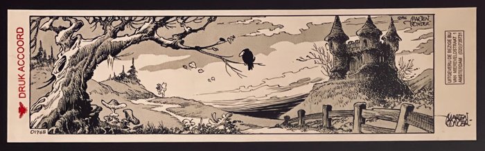 Marten Toonder tekende in 1986 de allerlaatste dagstrook (01768) van Tom Poes. Met dat historische feit wilde de uitgeverij natuurlijk iets doen. De nu ter veiling gebrachte prent is een hoogwaardige proefdruk voor iets waarmee men daartoe onder handen werk was; een geïnitieerde gelegenheidsprent of iets dergelijks. De nu aangeboden hoogwaardig gedrukte prent is voorzien van een stempelopdruk/imprint van de uitgeverij (Bezige Bij), van een "druk accoord" en de prent is rechts onderin gesigneerd.