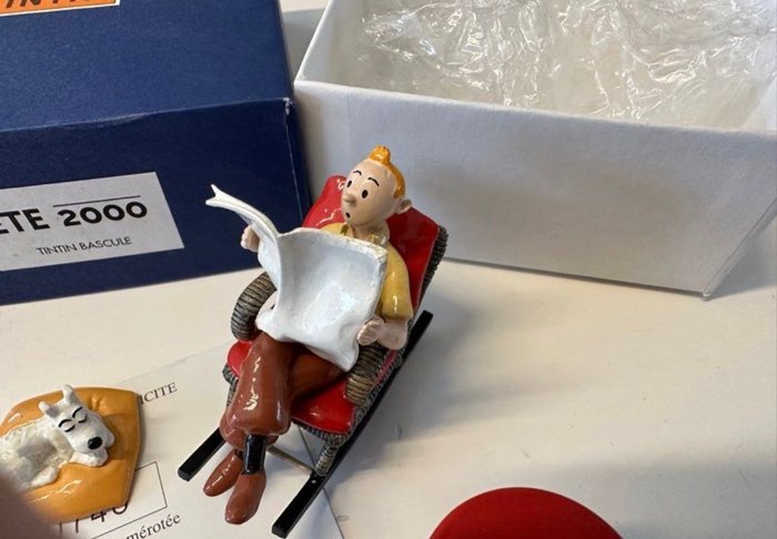 De doos bevat: Kuifje leest de krant, Bobbie op zijn kussen, een schommelstoel, een voetstuk, een fles en een glas