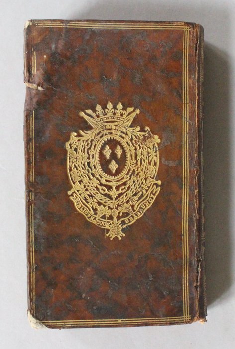 Een volume in-12 (145x85 mm), volledig gemarmerd kalfsleer, driedubbele vergulde bies die de omslagen omlijst, versierde omslagen, versierde gladde rug, titel- en deelnummers in rood marokijn, witte schutbladen, rode randen (hedendaagse banden). Slijtage en wrijven op de covers, onderkaak gebarsten op 1-2 cm, staartkap gedeeltelijk geëgaliseerd, afgestompte hoeken. Fris interieur, zeldzame foxing