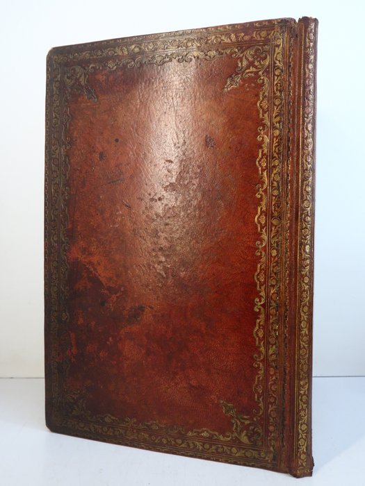 Conditie: Exemplaar in goede staat van bewaring, solide, het leer is een beetje vervaagd, lichte slijtage, fragmenten van de twee kronen ontbreken, doorboorde hoeken, donkere vlek op de achteromslag. De vergulding van de eerste schaal is in goede staat, op de tweede gevlekt, rug in goede staat. Functioneel object. In goede staat.