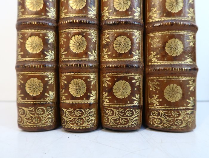 Zeer decoratieve set, lichtgevende vergulding. Banden in zeer goede staat, 3 hoekjes iets doorboord. Fris en schoon interieur. In volumes 1.2 & 3 wettings in het onderste deel, vrij discreet, op bepaalde uitgesproken bladen.