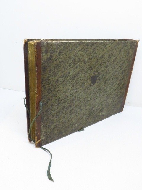 Contemporaine band, bruin halfleer met bandsluiting met twee veters. Dempen terug. - Schuring door gebruik op doppen, kaken en platte randen. Vast volume. Variabele foxing afhankelijk van het bord, over het algemeen verspreid, vaker op sommige borden (zie foto's).