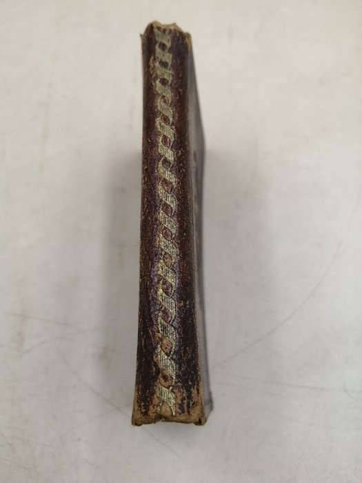 Gebonden in Marokkaans leer, 9,9 x 6,3 cm, 48 pagina's. Rug met dwars verguld wiel en met goud versierde platten.Binnen wat versleten, en de pagina's zijn geroosterd aan de binnenkant. De uiteindelijke kalender staat los van het boek, zie foto's. Het totale werkpakket is goed.