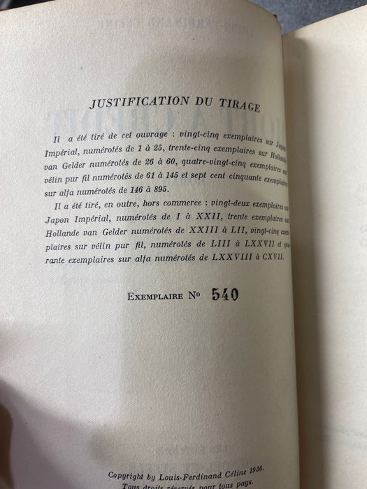 Editions Denoël et Steel, copyright 1936, vermelding van de 895 Edition (exemplaire numéro 540, imprimerie des Editions Denoël et Steel, Parijs, 1936.
