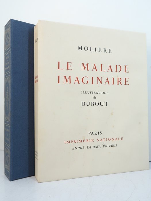 Zeer mooie uitgave van de Nationale Drukkerij van "Le Malade imaginaire" van Molière (1674), gesierd met 20 aquarellen ingelegd door Albert Dubout, waarvan één op dubbele pagina, allemaal met de hand ingekleurd door Maurice Beaufumé.