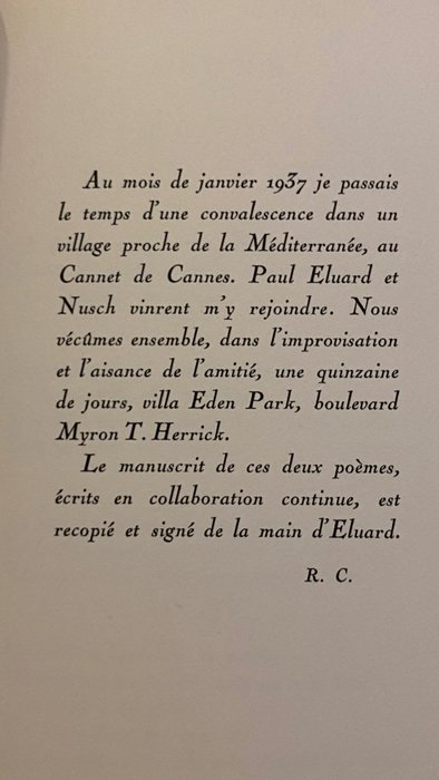 Omslag geïllustreerd met een gekleurde Oost-Indische inkttekening door René Char; reproductie van een ongepubliceerd fotografisch portret van Paul Éluard als frontispice; handtekening facsimile van een van de gedichten. Slipcase van de uitgever.