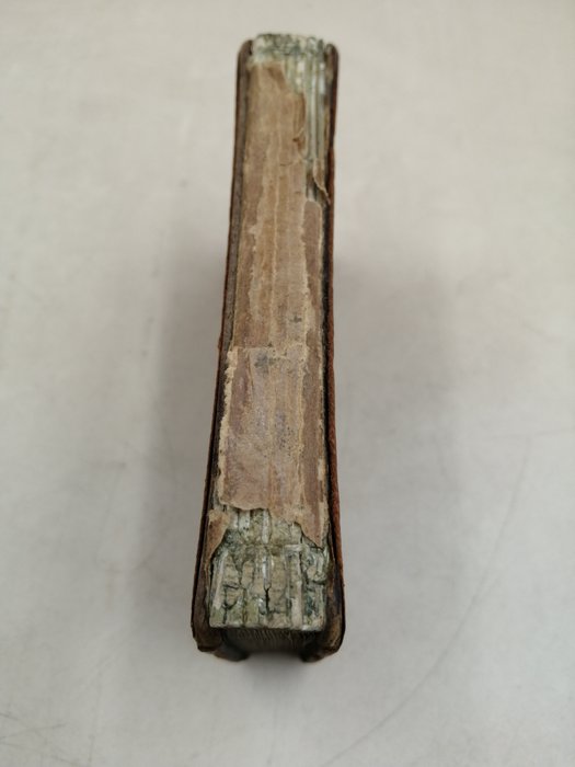 Gebonden in Marokkaans leer met gouden motieven, 10,4 x 6,4 cm. miniatuur formaat Rommelige paginering. De rug ontbreekt en de band is wat sleets. Het heeft een los blad. Over het algemeen is de set van het werk goed.