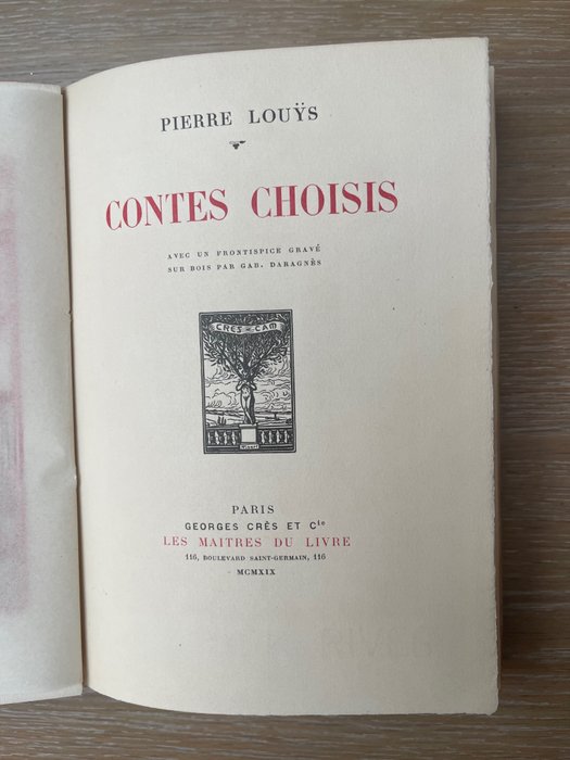 Hier verkopen is een mooi voorbeeld van Pierre Louys', 'Contes Choisise'. Gelimiteerd tot 1650 exemplaren, dit is nummer 704. Gebonden in de originele omslagen.