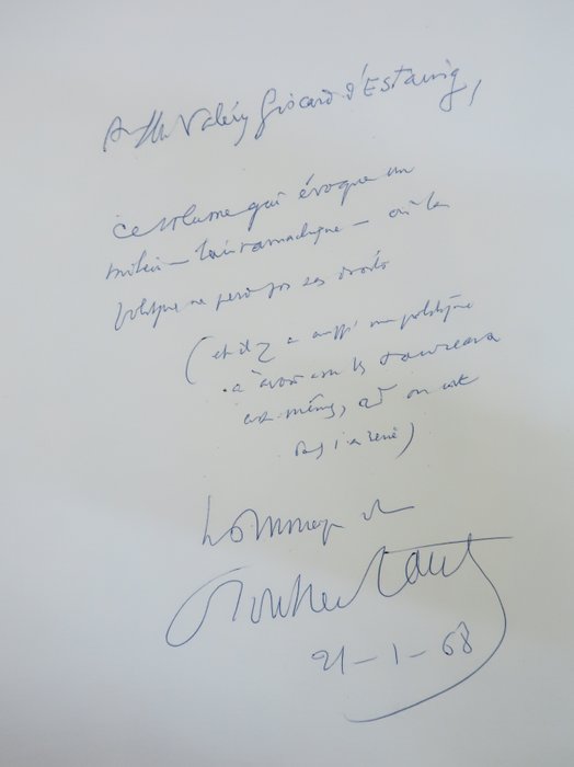 Henry de Montherlant: "Aan de heer Valéry Giscard d'Estaing, dit boek dat een stierenvechtomgeving oproept, waar het fysieke zijn rechten niet verliest. (er is ook een beleid voor de stieren zelf [... enkele niet-ontcijferde woorden] . Eerbetoon aan Montherlant 21-1-68".