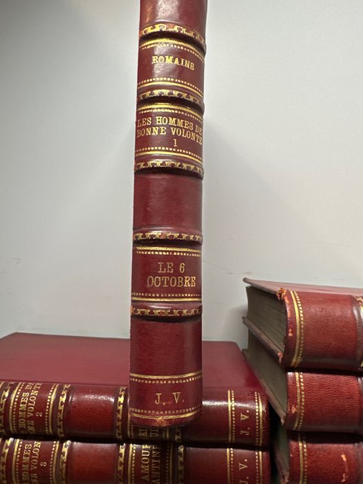 Volledig gesigneerde 27-delige set in rode aangepaste lederen band uit de persoonlijke collectie van de Spaanse socialistische politicus Juan-Simeon Vidarte (1902-1976). 22 boeken in de set gesigneerd door Jules Romains met persoonlijke inscripties aan Vidarte in boeken 1, 21 en 22.
