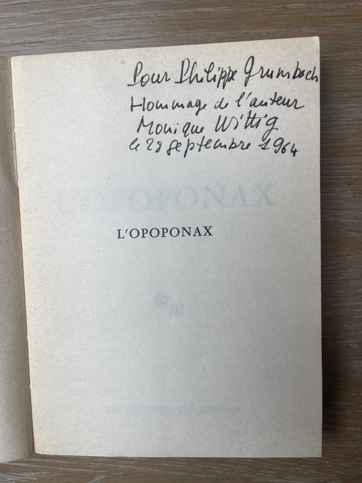 Hier verkopen is een mooi voorbeeld van 'L'opoponax' van Monique Wittig. Ingeschreven door de auteur op de halve titel. Gebonden in de originele omslagen.