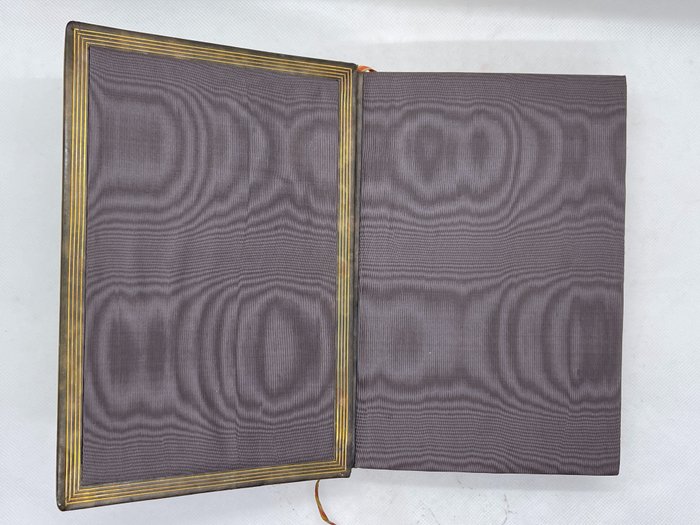 Volledig gemarmerd kalfsleer, gladde rug, vergulde kop, moiré schutbladen, dubbel gemarmerde schutbladen, platten en rug behouden. Lichte slijtage aan de hoeken, papier wat vergeeld aan de rand (het blauwe papier veroudert zo stelselmatig).