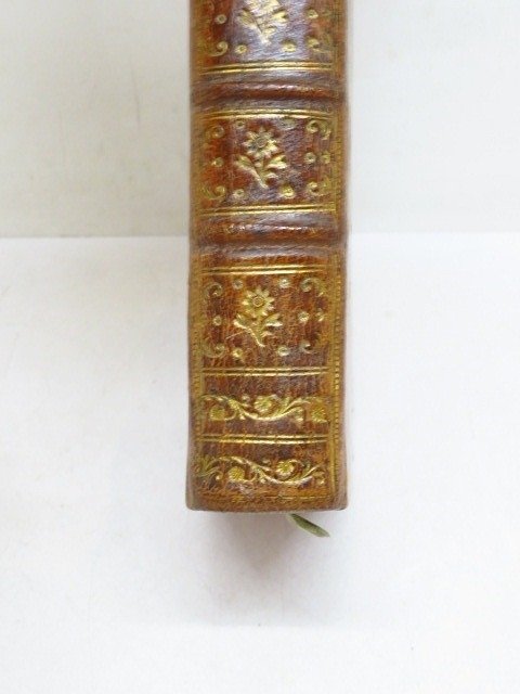 Volledig lederen band, eigentijdse gemarmerde schapenvacht, geribbelde rug versierd met de titel, fleurons en vergulde dozen. Rode plakjes.