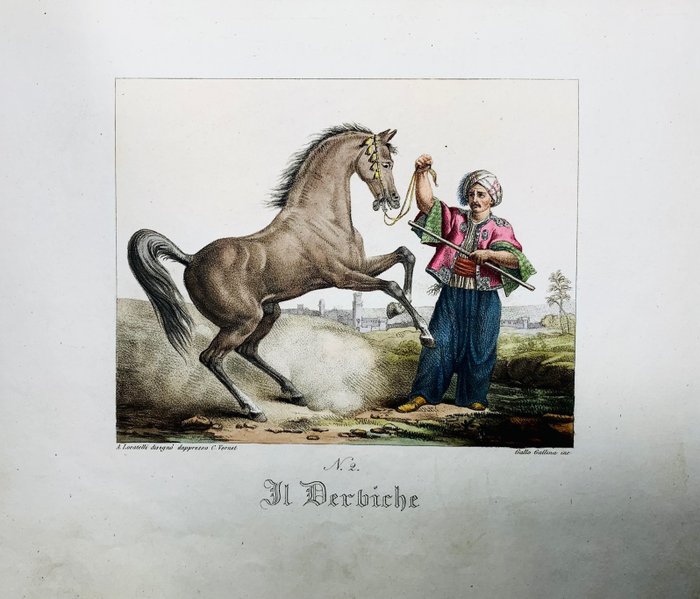 ATLAS-1 volume in-4 (mm. 295x222), titel en met 77 prachtige platen waarvan: 24 prachtig verlucht, getekend en gegraveerd door A. Locatelli “dappresso Carl Vernet”, met geanimeerde taferelen met de verschillende soorten paarden; de overige 53 (eigenlijk genummerd 52, 44 is bis) - gelithografeerd in b.n. en qua kleur betreft: bitten, anatomie, beslag, tuigage, zadels, ringen, diverse gangen van het paard, waaronder 1 prachtig verlicht aanzicht van "de race der Feesten en de Ring".
