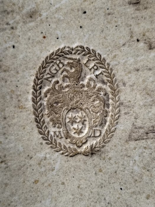 Breed octavo-volume (203 mm x 171 mm) in eigentijds perkament met gekartelde voorranden, drie overgebleven van vier overgebleven originele stoffen banden, manuscripttitel op de rug, ovale armen met goudstempel in een krans met de letters 'NGB LRI MD.' naar beide covers, en perkament terug. Tegenoverliggende schutbladen en twee schutbladen voor en achter. In oude inkt is er een kleine hoeveelheid waarschijnlijke schapidentificatieletters en -nummers, sommige binnen een klein geplakt label, op het tweede schutblad verso. Tekst in dubbele kolommen in alle drie de delen en indexen.