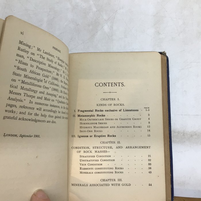 "Prospecting for Gold - a handbook of practical information and hints for prospectors based on personal experience" door Daniel J. Rankin met illustraties speciaal getekend en gegraveerd voor het werk - Crosby Lockwood, Londen - 1901 eerste editie - 14cmx12cm - staat: goed, in originele blauwe band met wat slijtage en wrijven aan planken en randen, compleet met illustraties.