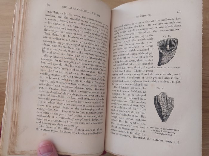 Oud paleontologisch boek met illustraties van fossielen, jaar 1857.
