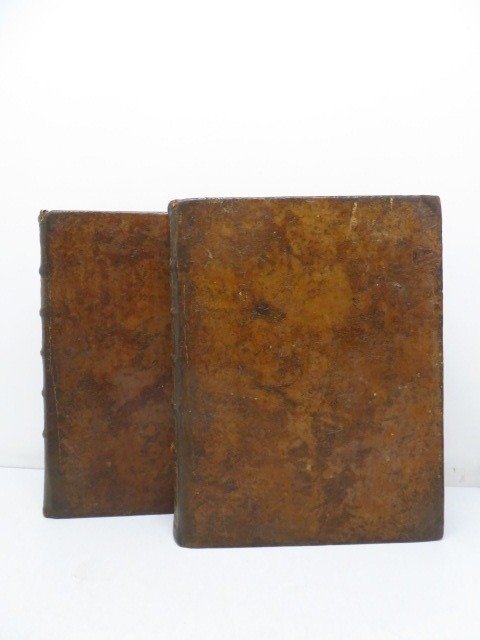Twee historische banden van volledig gemarmerd en geglazuurd kalfsleer, geribbelde rug versierd met een titel- en deelnummerstuk, decor met fleuron-partities geslagen met verguld ijzer. Rode plakjes.