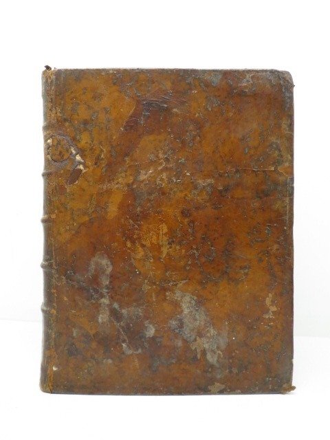 Gebonden exemplaar, periode volledig gemarmerd kalfsleer. Achterkant met opstaande banden gedecoreerd met een rijke versiering met vergulde ijzers. Stukjes rood marokko met vermelding van de titel en het jaartal. Rode plakjes.