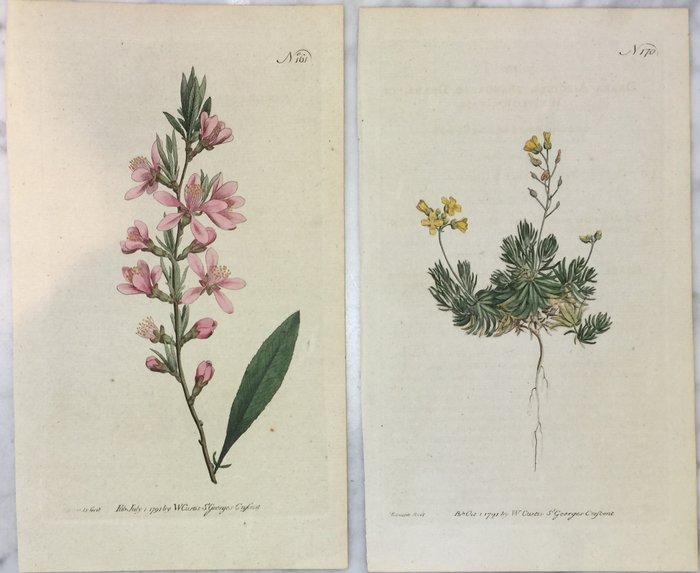 Lot van 8 handgekleurde gravures uit The Botanical Magazine van William Curtis. De gravures dateren uit de periode 1788-1792. Het gaat om de volgende platen: 61, 62, 149, 160, 161, 170, 172 en 175. De foto's maken deel uit van de beschrijving.