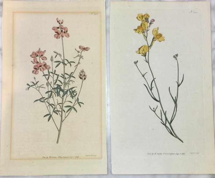 Lot van 8 handgekleurde gravures uit The Botanical Magazine van William Curtis. De gravures dateren uit de periode 1792-1793. Het gaat om de volgende platen: 176, 180, 181, 191, 198, 200, 210 en 215. De foto's maken deel uit van de beschrijving.