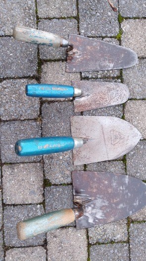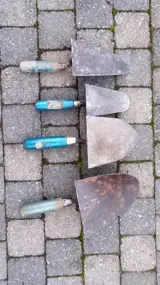 Metsel gereedschap troffels gebruikt maar in goede staat afmeting op volgorde 1. afgerond 19 cm.2 . puntig 17 cm.3. afgerond 14 cm.4. afgerond 17 cm.alleen samen te koop 40 euro