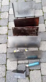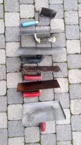plakspanen voegbord en buitenhoektruweelbuitenhoektruweel 10cm.x 6 cm.getande plakspaan 28 cm. x 12 cm.plakspaan 18 cm. x 13 cm. 2 plakpanen 25 cm. x 10 cm.inox voegbord 23 cm x 14.50 cm.alleen samen te koop 60 euro.