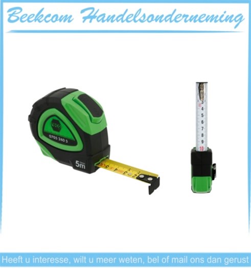 Rolmaatband in hoogwaardige, slagvaste 2K kunststof behuizing met maateenheden aan beide zijden. Band met nyloncoating. Band voorzijde: horizontale indeling, geel gelakt, mat. Band achterzijde: verticale indeling, wil gelakt, mat. Verkrijgbaar in de lengtes 3m, 5m en 8m (alle uitvoeringen met broekklem). De rolmaatband heeft een automatische terugloop met blokkeerknop.