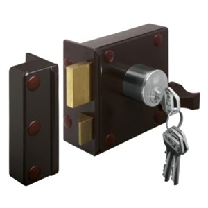 Opliggend voordeurslot voorzien van dag- en nachtslot vaste cilinder. Specificatie: - bediening dagschoot aan binnenzijde door trekknop, met blokkeermogelijkheid in ingetrokken stand door trekknop halve slag te draaien, en aan buitenzijde door sleutel, - rechthoekige messing nachtschoot, 1-toers - 20 mm, - bediening nachtschoot aan binnen- en buitenzijde door sleutel, - met wissel, - slotkast, staal, bruin gemoffeld, wordt meegeleverd, - vaste buitencilinder, messing vernikkeld, met afdekring en 3 nieuw zilveren cilindersleutels.