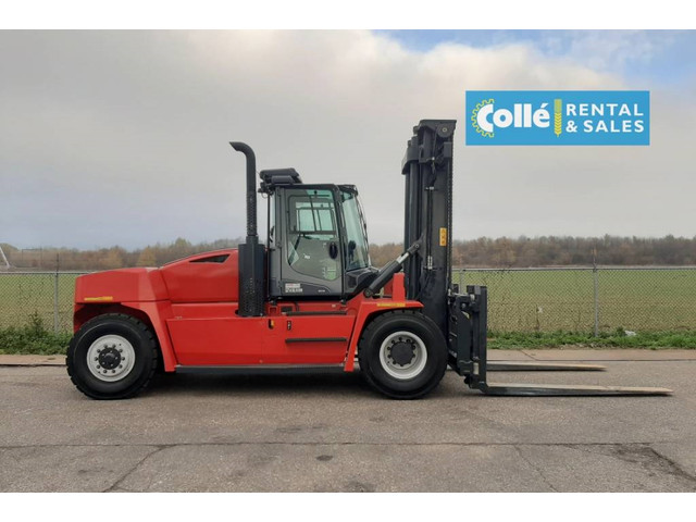 The Kalmar DCG160-12 is a heavy-duty diesel forklift with a lifting capacity of 16,000 kg and a maximum lifting height of 4.0 metres, designed for intensive industrial applications. The machine is powered by a robust Cummins 6-cylinder Stage V engine rated at 168 kW, combined with a fully enclosed EGO cab with air conditioning and a hydrodynamic Powershift transmission for smooth and efficient operation.