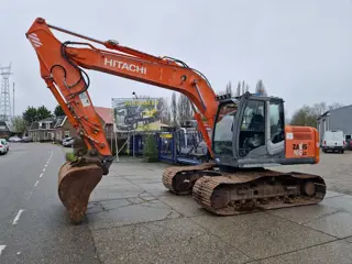 Hitachi ZX160LC-3 van bouwjaar 2003 met hydraulische snelwissel CW30, brede bak, alle hydraulische functies zoals hamer-, grijper/draai- en sloop/sorteerfunctie, het rijwerk is zeer netjes wel 85%, met 4-cilinder Isuzu motor 13022 afgelezen uren, 90.2 kW, slangbreukbeveiliging, het betreft een Nederlandse machine