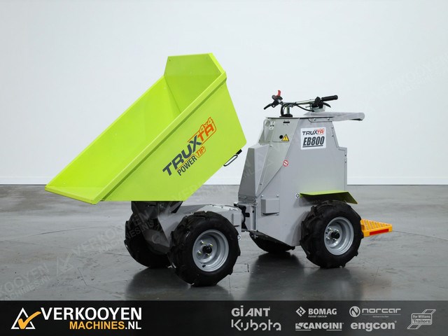 Nieuwste Truxta EB800 PT - 100% Elektrisch! Elektrisch-Hydraulisch kippende bak 2x 1400W DC elektromotor 24V 800kg laadvermogen Automatisch Hill-hold remsysteem Maximale rijsnelheid van 6 km/h Geluidsniveau < 76Db Waarom Truxta: Volledig elektrisch aangedreven met een werktijd van 10uur op één acculading Verwisselbare opbouw (ook platform beschikbaar ipv bak) Zeer wendbaar met pendelend knikchassis Compact gebouwd met een centraal hefpunt Onderhoudsvrij en ultrastil De nieuwe EB800 elektrische BENDie mini-dumper heeft een laadvermogen van 800 kg en is daarmee de grootste in het huidige Truxta-gamma van 300, 400, 450 en 500 kg laadvermogen-eenheden. Als primeur heeft de EB800 een neerklapbaar opstapje achteraan, zodat de bestuurder over langere afstanden op de achterkant van de machine kan rijden. De Truxta heeft een geweldige verhouding tussen laadvermogen 800 kg en machinegewicht van 500 kg en biedt een uitstekende capaciteit en productiviteit. Bakbreedte: 85cm Totale breedte: 89cm Elektrische dumper / elektrische kruiwagen
