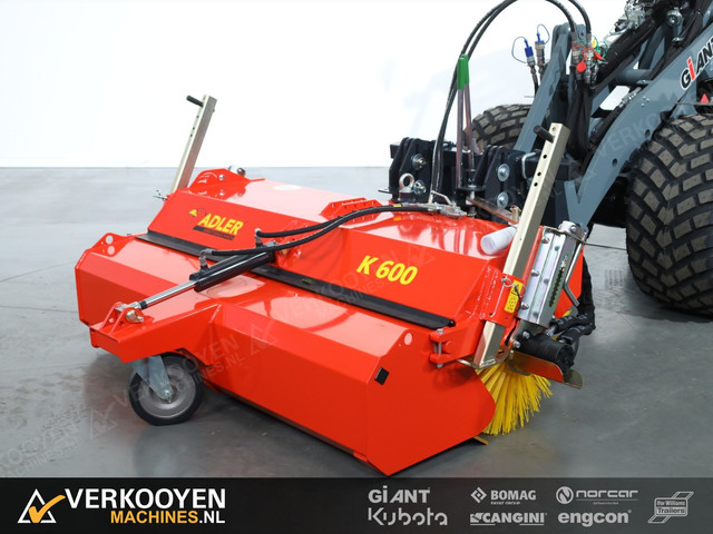 Adler K600 180cm veegmachine. Onderstaand de voordelen ten opzichte van de concurrentie: - Grotere borsteldiameter van 600mm - Vegen met de standaard hydraulische ledigingsbak open mogelijk doordat scharnierpunt hoger zit - grotere inhoud opvangbak - Borstelverstelling is traploos met draaispindel. - De borstelverstelling werkt schuin naar de ledigingsbak toe zodat bij borstelslijtage de borstel ook naar de ledingsbak toe beweegt. - Degelijker plaatmateriaal, standaard gepoedercoat - Zware zwenkwielen 250mm - Standaard naloopbeveiliging (beschermt uw hydraulische aandrijving) Voor deze Adler veegborstel is ook een zijborstel en watersproei-installatie leverbaar.