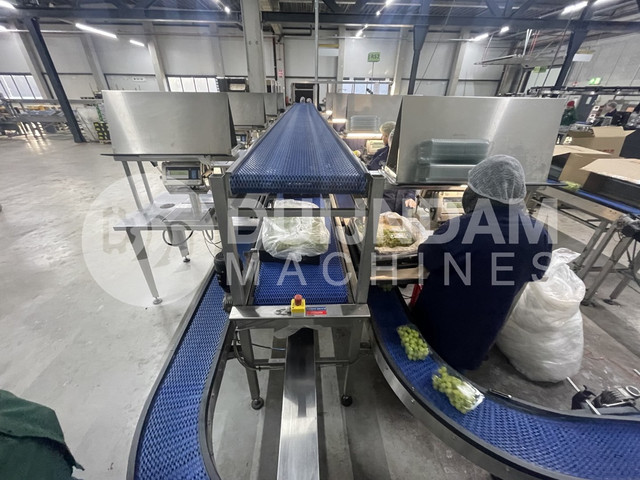 Afvoerband / bovendste band lege dozen 865 cm x 50,5 cmAanvoerband volle dozen (Bestaat uit verschillende secties allen apart aangedreven)3 x 210 x 53 cm en 1 x 500 x 50,5 cm + rollenbaan 200 x 50 cm