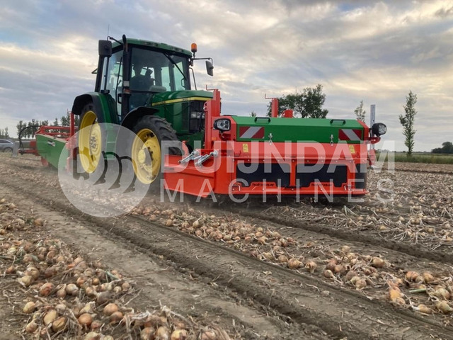 De meest efficiënte wijze is na het “klappen”,in één werkgang de uien rooien. De uienloofmaaiers zijn standaard voorzien van elektro-/hydraulische hoogte regeling doormiddel van grondvoelers en sensoren. Hierdoor wordt het loof altijd op de juiste hoogte afgesneden. De maximale uitslag is 40 cm.De maaier wordt standaard voorzien van twee wielen, een aftakas en de binnenkant van het maaidek is met rubberbekleed voor het eenvoudig reinigen en/of afsteken van loofresten. De mesrotoren worden door de aftakas van de trekker via een zware tandwielkast en V‐snaren aangedreven. Afhankelijk van 3‐punts en/of frontaanbouw moet de aftakas ca. 1000 omw./min draaien.