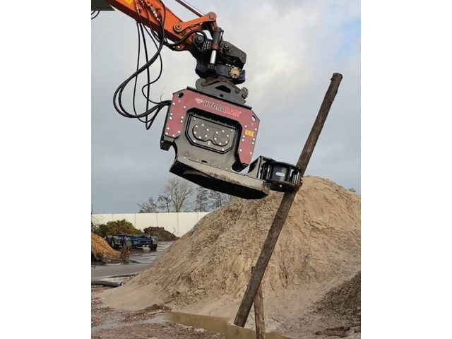 Nieuwe hydraulische trilblokken met palenklem. De machinist zet nu eenvoudig en zelfstandig palen in de grond. Verkrijgbaar voor machines van 1.5 tot 50 Ton. Grotere uitvoeringen zijn voorzien van een dubbel excentriek. Wordt geleverd met stalen buis onder het blok om in harde ondergronden de grond eerst voor de steken. Kan bij demontage van de onderbouw ook gebruikt worden als normale grondverdichter.