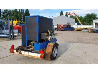 Zelfaanzuigende waterpomp/vuilwaterpomp/bronbemalingspomp met 1-cilinder Petter dieselmotor, handmatig gestart, op geremde aanhanger, kan op diverse manieren ingezet worden