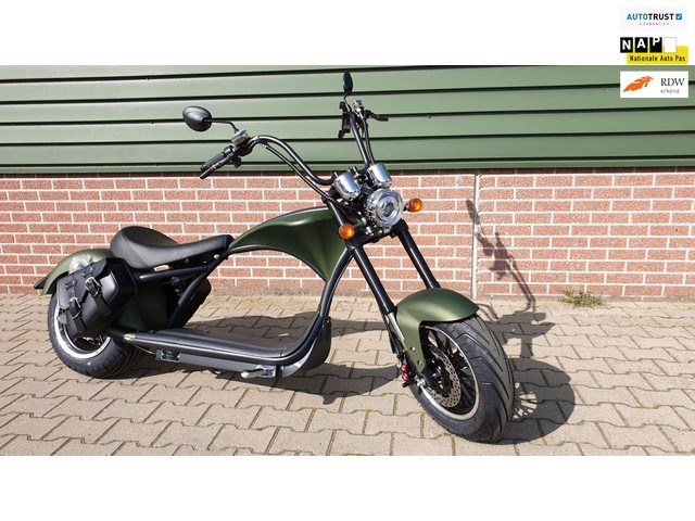 Deze stoere e-scooter heeft brede banden, dubbele schijfremmen en een robuuste constructie. Dit alles zorgt voor een prettige wegligging, korte remweg en fraai uiterlijk. Deze e scooter wordt geleverd met sterke 2000w motor en draagbare accu. Ook beschikt de machine over schokdempers onder het zadel, een digitale snelheidsmeter, alarmsysteem met afstandsbediening, stuurslot en praktische accessoires zoals een telefoonhouder met USB aansluiting. Zo kun je bereikbaar blijven en navigatie gebruiken. Deze e scooter is RDW gekeurd en mag de openbare weg op zonder helm met een maximum snelheid van 25km/u. Met een volle batterij kun je ongeveer 60 km afleggen. De draagbare accu kun je opladen waar je maar wilt. Deze e scooter is klaar om direct mee de weg op te gaan. Andere kleuren zijn eventueel mogelijk op bestelling.