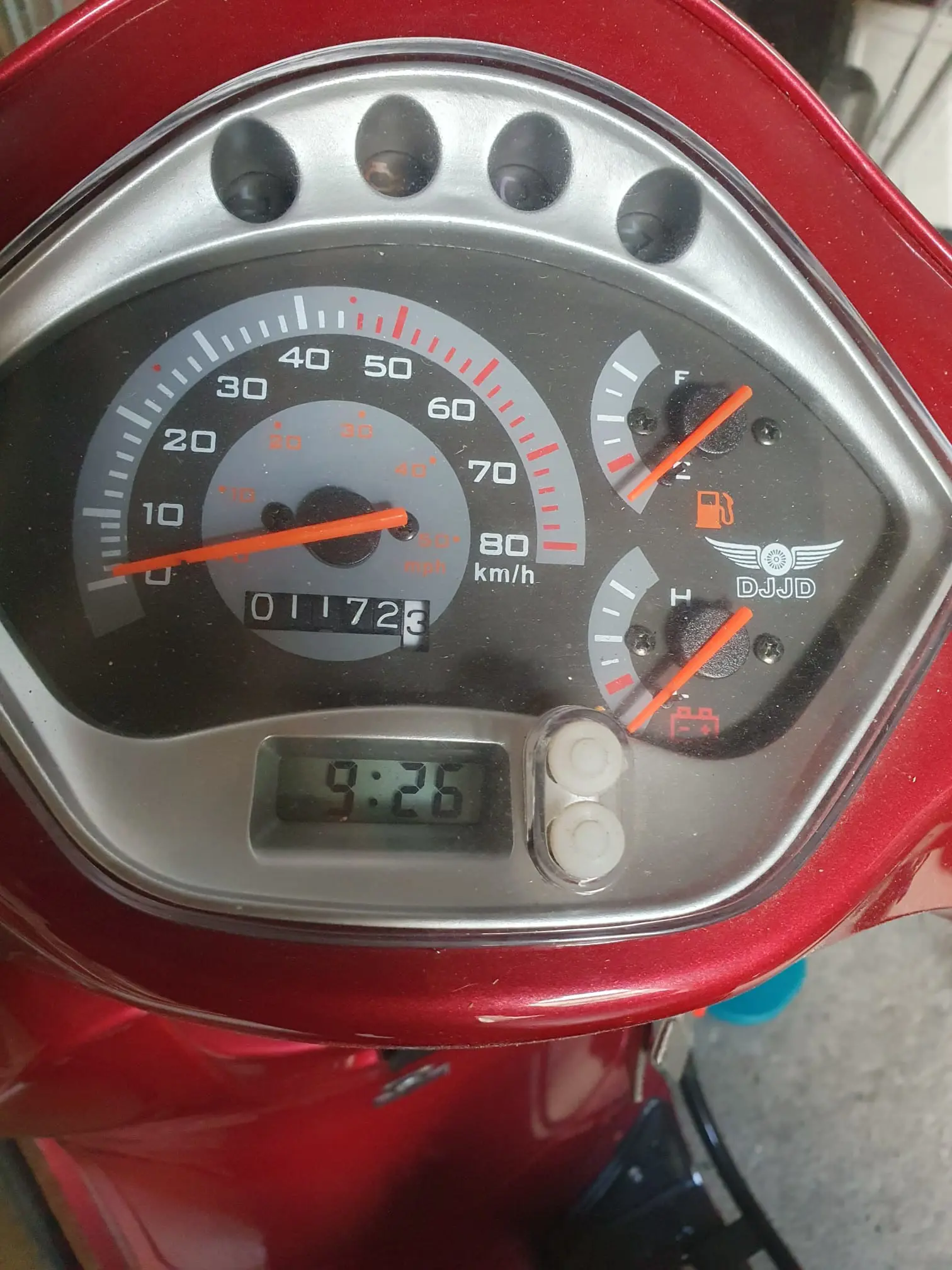 Mooie snorfiets, rood met zwarte koffer merk DJJD weinig gebruikt.