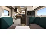 Binnenin valt direct de harmonieuze indeling op. De ruime L-zit vormt samen met de draaibare cabinestoelen een comfortabele loungeplek. De middenkeuken is praktisch ingericht met gascomfoor, koelkast met vriesvak en een uitschuifbaar werkblad – ideaal voor wie ook onderweg graag kookt.