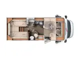 De 145 RB-LE heeft 2 draaibare voorstoelen, een L zitgroep, L keuken, aparte douche- en toiletruimtes en achterin de camper 2 enkele bedden met daaronder een flink garage.