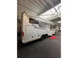 een L zitgroep, Middenkeuken, aparte middentoilet en doucheruimtes, 2 ruime enkele bedden achterin in de camper met daaronder een enorme garage.