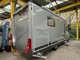 een L keuken, aparte douche- en toiletruimtes, achterin de camper een queen size vrijstaand bed met daaronder een flinke garage.