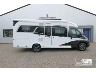 Achterin bevindt zich het comfortabele Franse bed met koudschuimmatras en lattenbodem Goods Side. Hiernaast is de badkamer met aparte douche, toilet en wasbak, voorzien van dakluik en spiegelkasten