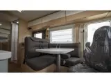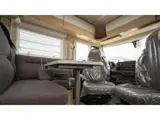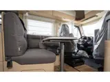 Door de voorstoelen te draaien ontstaat een ruime zithoek met L-zit met een draaibare én in de lengte en breedte verschuifbare tafel. Het Grand Oak meubeldecor in combinatie met de luxe stof “Janeiro’’ bekleding geven de zithoek een lichte uitstraling. De bovenkastjes geven een extra ruimtelijk gevoel en stahoogte. Door het AL-KO chassis beschikt deze camper over een volledig vlakke vloer. In de mee verwarmde dubbele bodem bevindt zich, naast de schoon- en vuilwatertank, extra opbergruimte die doormiddel van de luiken in de vloer én van buitenaf te bereiken is. Uiteraard zijn alle ramen en de toegangsdeur voorzien van horren en plisséverduistering.