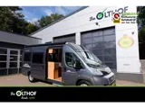 De voorstoelen zijn draaibaar, er zit een vaste eethoek, toiletruimte en keukenblok met o.a. spoelbak, kookplaat op gas en koelkast in deze buscamper gebouwd.