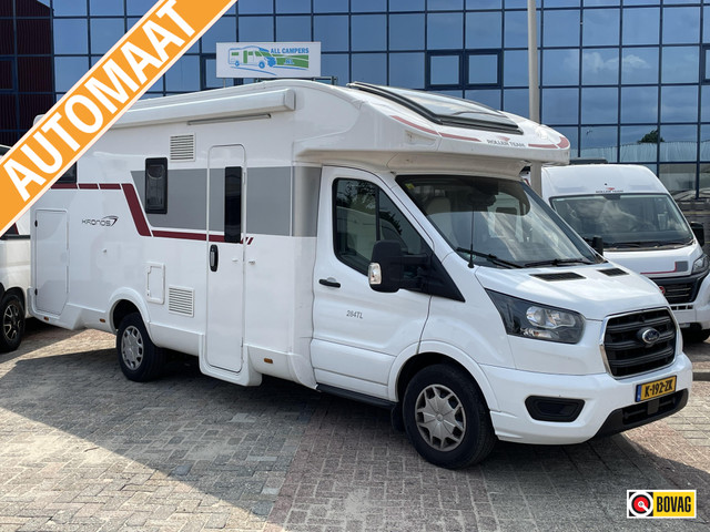 Roller Team Kronos 284 TL polyester opbouw, aparte bedden, hefbed, ruime garage, douche en toilet gescheiden. L-keuken.