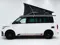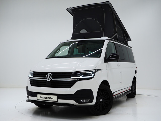 Volledig nieuwe Volkswagen California T6.1 Edition met hoogglans zwarte raamlijsten, zwart dak, sidebars, bumperdetails, frontsplitter, zwarte spiegelkappen en hooglans zwarte velgen.