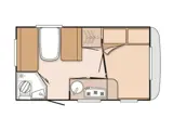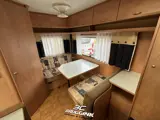 Met achterin de caravan een treinzit en een hoektoilet. Middenin de caravan de keuken en voorin het vaste dwarse 2 persoons bed.